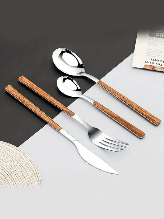 24Pcs Cutlery Wooden Handle Cutlery Set Stainless Steel Tableware Knife Fork Tea Spoon Silverware Western Flatware